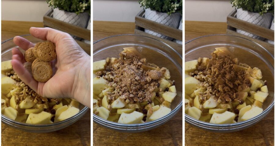 Despeje as maçãs em um refratário e cubra-as completamente com a base de crumble.
