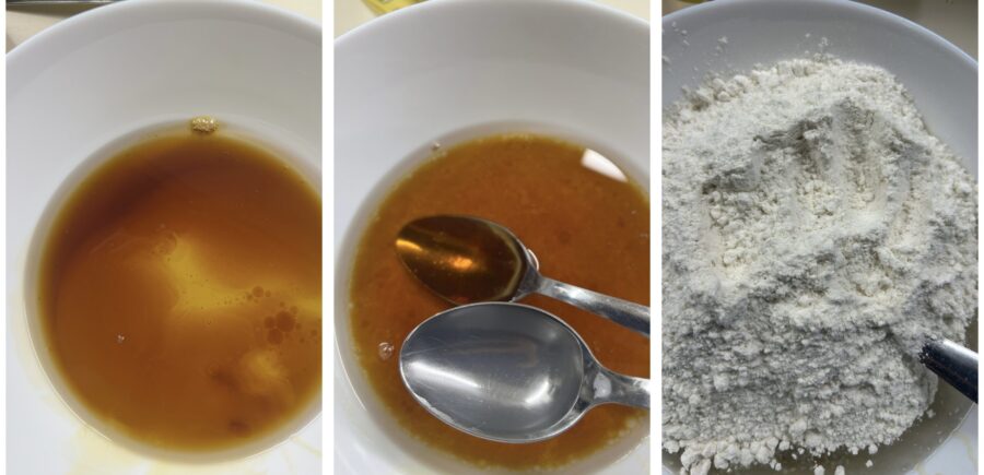 • Junte numa tigela o mel, o açúcar invertido, também chamado golden syrup porque contém uma parte de melaço e que você pode substituir por xarope de bordo (maple syrup), a água de lixívia (composta por 1 parte de carbonato de sódio – Kansui – e 4 partes de água) e o óleo de amendoim, misture e adicione a farinha, o sal e o fermento.