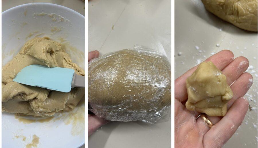 • Trabalhe a massa com uma espátula e, quando ela ganhar consistência, envolva em filme plástico e deixe descansar na geladeira por 1 h. Será uma massa de textura macia, mas fácil de trabalhar, bem diferente da massa sablée tradicional. Depois do tempo, divida a massa em bolinhas de 35–40 g, mas tudo depende do tamanho das suas formas.