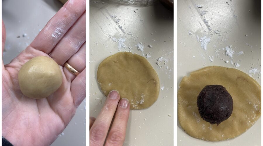 • Com um pouco de amido, achate as bolinhas formando discos, coloque sobre cada disco uma bolinha de geleia de azuki (para a preparação veja o link acima) que deve estar fria e ter descansado pelo menos 24 h na geladeira, e envolva‑a uniformemente com a massa.