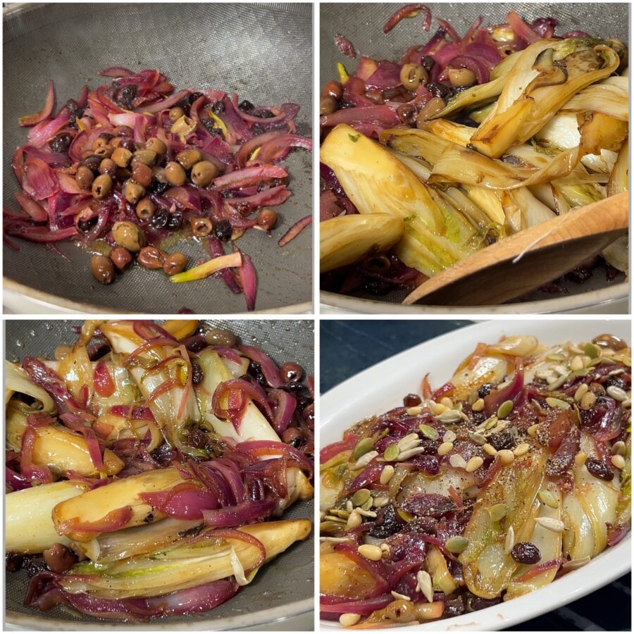 Preparo da endívia belga agridoce com cebolas e azeitonas