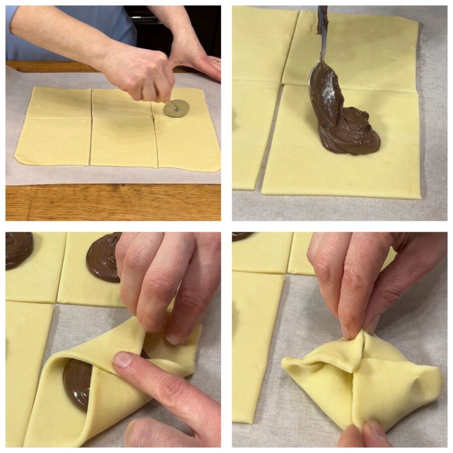 • Para fazer os fagottini de massa folhada, divida a massa em 6 quadrados iguais. Coloque um pouco de creme para passar no centro de cada quadrado, sem exagerar. Feche cada quadradinho formando um fagottino, dobrando as pontas para o centro e selando as bordas com um pouco de pressão nos cantos.