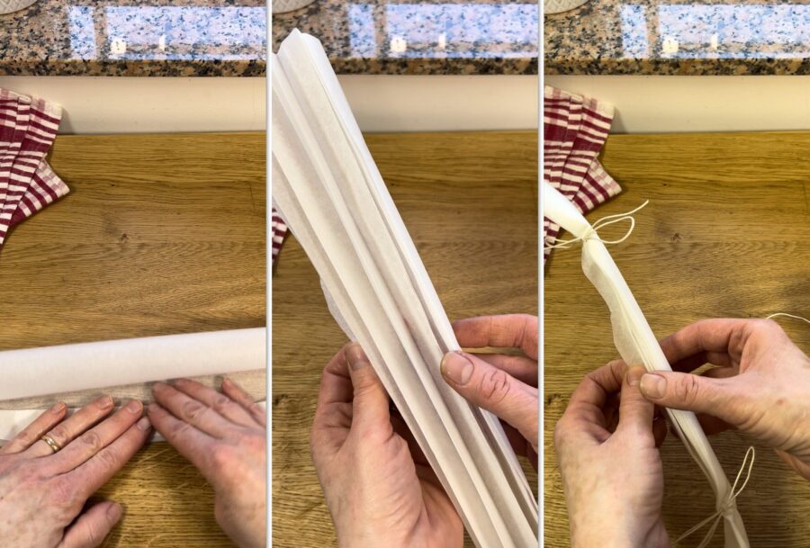 Para preparar os filés no papelote, comece fazendo as barquinhas de papel manteiga. Corte duas folhas de papel manteiga com cerca de 35×35 cm, dobre-as várias vezes como na foto até obter uma forma sanfonada, amarre as extremidades com o barbante de cozinha e abra formando as barquinhas que vão receber o peixe.