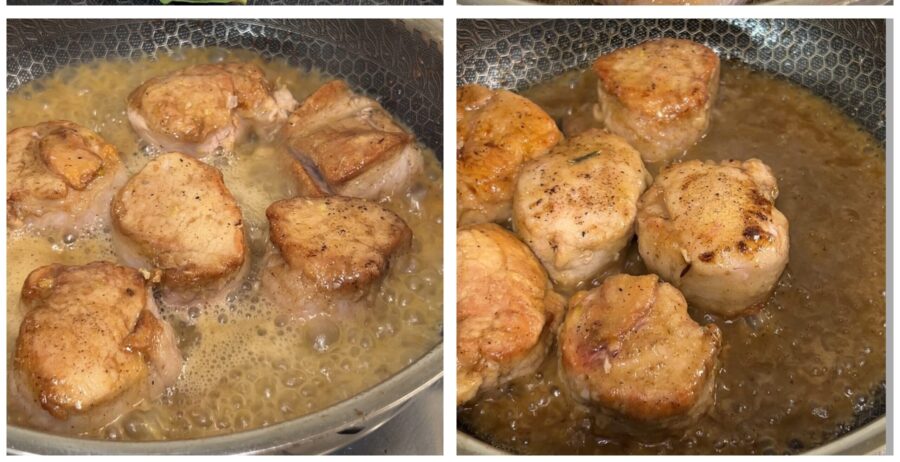 Coloque na frigideira alho, louro, alecrim e manteiga. Comece a derreter a manteiga; ter a manteiga clarificada seria melhor porque tem ponto de fumaça mais alto. Acomode os medalhões e cozinhe por dois minutos de cada lado, virando com cuidado para não furar a carne. Quando estiverem bem dourados, acrescente o mel e depois o caldo quente, que já está salgado, então não será necessário adicionar mais sal; retire o alho, o ramo de alecrim restante e o louro.