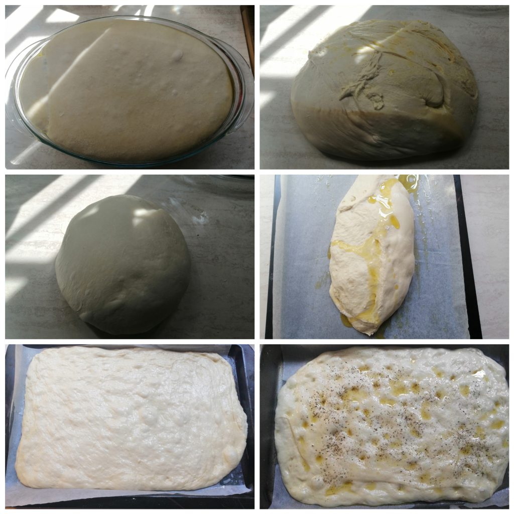 Se, como eu, quiserem fazer uma focaccia fina, forrem uma assadeira com papel manteiga, untem, coloquem o pedaço de massa por cima e com as mãos untas estiquem-na; se estiver muito elástica, deixem descansar dez minutos e voltem a esticar até obter uma camada pouco mais de meio centímetro de altura.