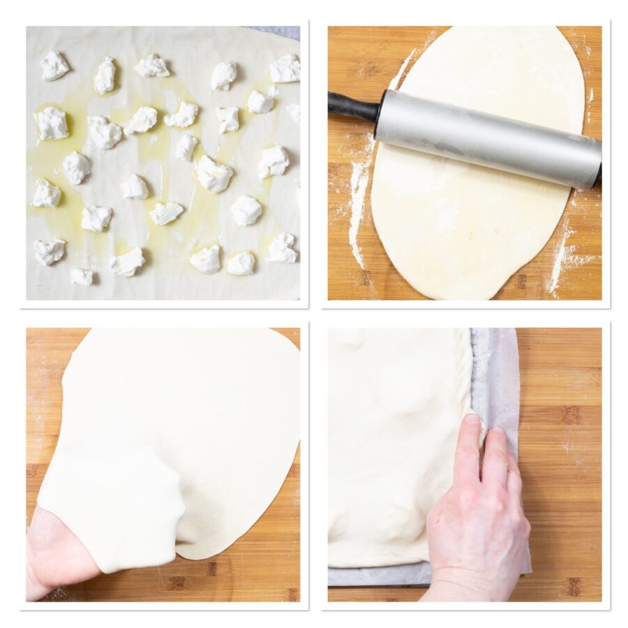 Distribua o queijo em pedaços por toda a superfície e regue com um fio de azeite (não previsto na receita original, mas cai muito bem). Abra outra folha de massa, se possível mais fina que a primeira, e cubra o queijo.