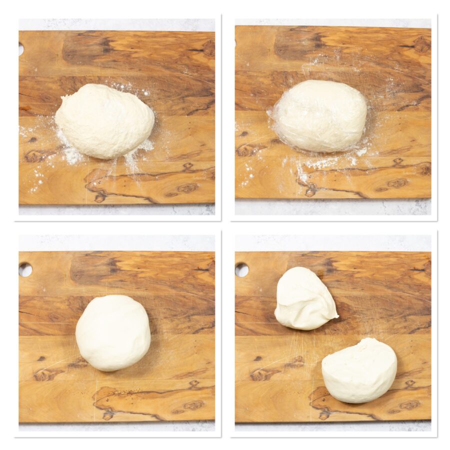 Quando obtiver uma massa elástica, transfira para a bancada enfarinhada e trabalhe até obter uma massa lisa, elástica e homogênea. Envolva em filme plástico e deixe descansar por 40 minutos em temperatura ambiente.