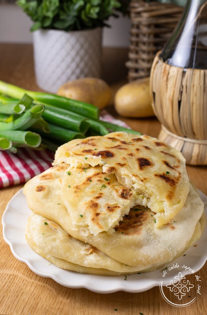 Focacinhas de batata com cebolinha e queijo, para fazer na frigideira em poucos minutos. As focacinhas de batata ou focacinhas de batata e cebolinha são um salva‑jantar fácil e rápido que você prepara num instante porque não levam fermentação. Essas focacinhas rápidas são feitas na frigideira, são sem fermento e recheadas com batatas amassadas, cebolinha fresca e queijo. Trata‑se de um preparo vegetariano caprichado que pode ser um antepasto rápido ou um prato único saboroso que agrada todo mundo. A receita das focacinhas de pão na frigideira recheadas com batatas e cebolinha é fácil e muito versátil; na verdade, nada mais é do que pão de batata com queijo cozido na frigideira, feito em poucos minutos. As focacinhas de batata e cebolinha ficam ótimas quentes ou mornas, você pode prepará‑las com antecedência e aquecê‑las quando precisar, podendo saboreá‑las a qualquer hora do dia. Perfeitas como antepasto ou como jantar econômico de última hora, fazem parte das muitas receitas com batatas que muitas vezes salvam o jantar e você pode levá‑las à mesa também em aperitivos ou lanches — vão desaparecer num instante. Se estiver com fome e curioso, experimente você também esta receita saborosa, mas antes lembro que, se quiser ficar atualizado sobre todas as minhas receitas, pode seguir minha página do Facebook (aqui), meu perfil no Instagram (aqui)