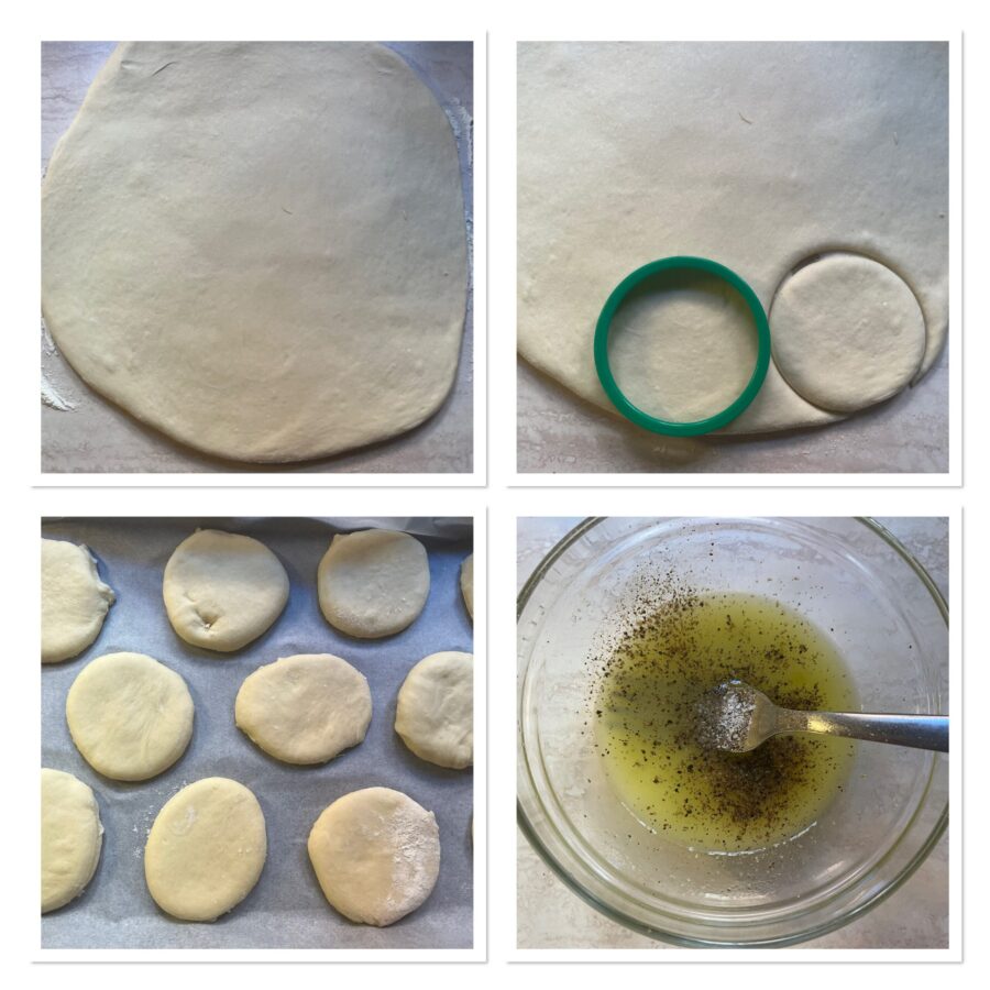 Corte a massa formando discos, amasse os restos e espere que fermentem antes de abrir a massa novamente. Coloque os discos em uma assadeira forrada com papel manteiga e deixe em local aquecido por 30 minutos, para que voltem a crescer.