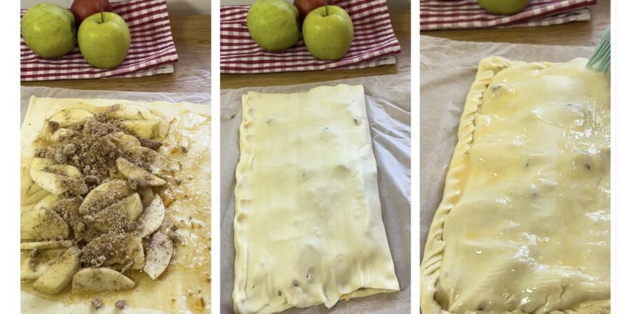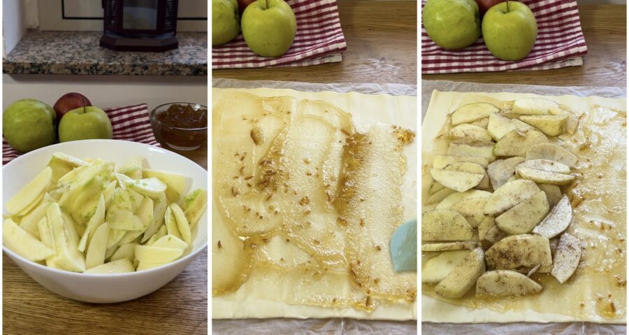 Desenrole a massa folhada, espalhe a geleia de laranja (eu prefiro porque é mais aromática) e coloque as fatias de maçã, mas só metade delas. Polvilhe com canela,