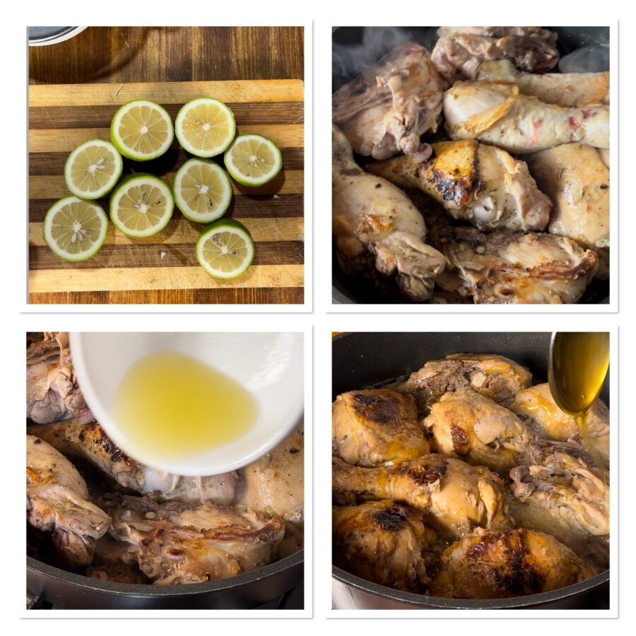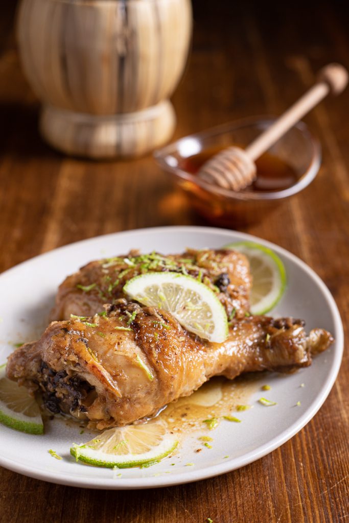 • Doure o frango em fogo alto até ficar bem dourado no próprio gordura, virando com frequência; não é necessário adicionar óleo. Enquanto isso, esprema os limões e faça o suco. Quando o frango estiver dourado, despeje o suco por cima, abaixe o fogo e tampe a panela. Cozinhe em fogo bem baixo por 35-40 minutos; você verá que o frango logo vai soltar bastante líquido e cozinhará nos próprios sucos sem precisar adicionar água. Passado o tempo, destampe, aumente o fogo e deixe o fundo reduzir; só agora junte o mel, regando por toda a carne, mexa, cozinhe mais um ou dois minutos e desligue o fogo.