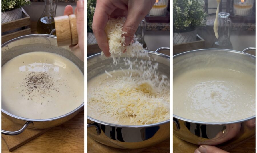 • evitando a formação de grumos. Termine com uma pitada leve de sal, pimenta a gosto e noz-moscada. Deixe no fogo médio até o molho engrossar; ele deve ficar ainda relativamente fluido (um bechamel muito firme não é indicado para esta preparação). Fora do fogo, misture o queijo ralado até incorporar.