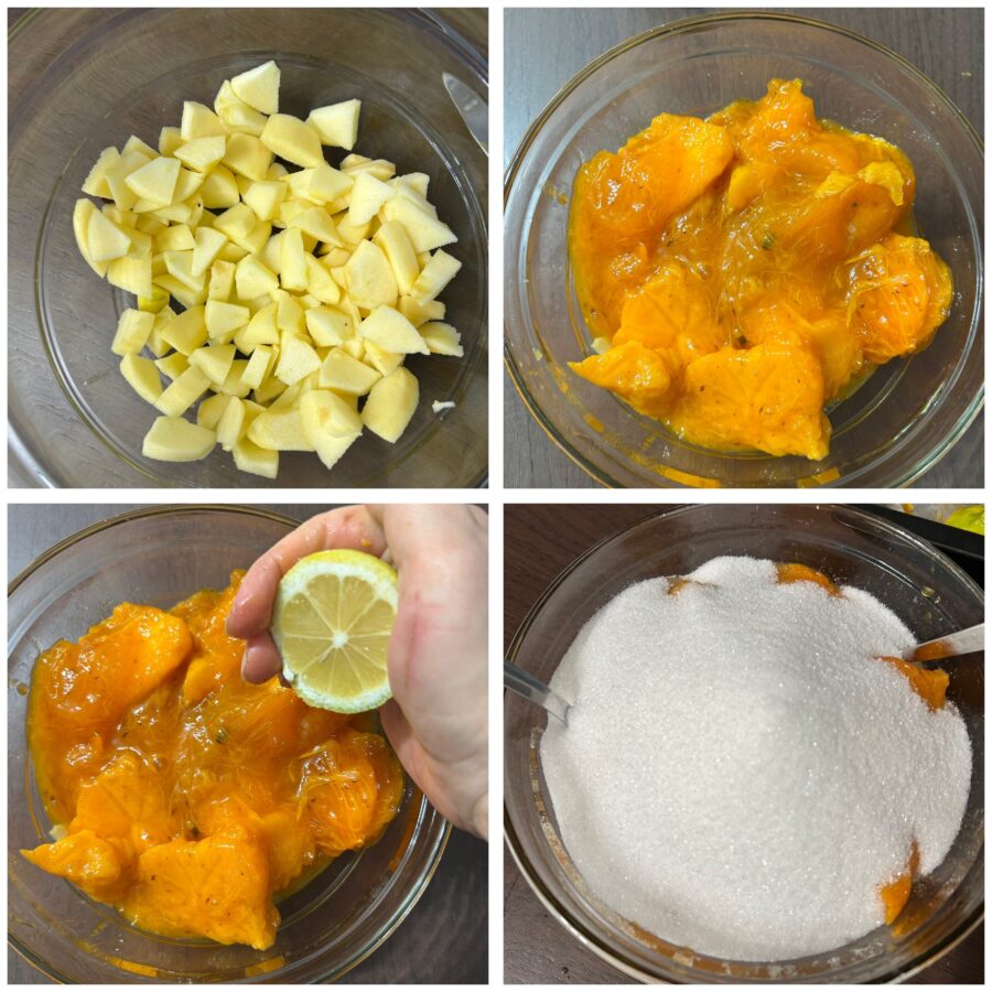 • Para fazer a geleia de caqui, descasque as maçãs e corte-as em cubinhos bem pequenos, junte a polpa dos caquis (já sem sementes e sem casca), o açúcar, o suco de limão e misture. Deixe descansar por uma hora.