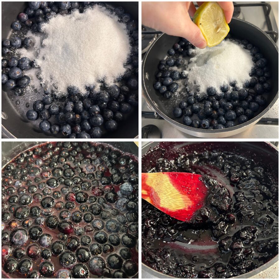 Para fazer a geleia de mirtilo, comece lavando e escorrendo bem os mirtilos. Em seguida coloque-os numa panela de fundo grosso, adicione o açúcar, o suco de limão e mexa. Cozinhe em fogo moderado por cerca de 15-20 minutos, mexendo frequentemente (se aumentar a quantidade de fruta, será preciso alongar o tempo). Normalmente a geleia está pronta quando, deixando cair uma gota num pratinho e inclinando-o, ela escorre lentamente; mas a geleia de mirtilo é uma exceção a esta regra, porque pode parecer líquida e engrossar depois de fria. Eu costumo colocar uma colherzinha num prato, misturar e, assim que esfriar, verifico a consistência da geleia para decidir se deixo cozinhar mais alguns minutos ou não.