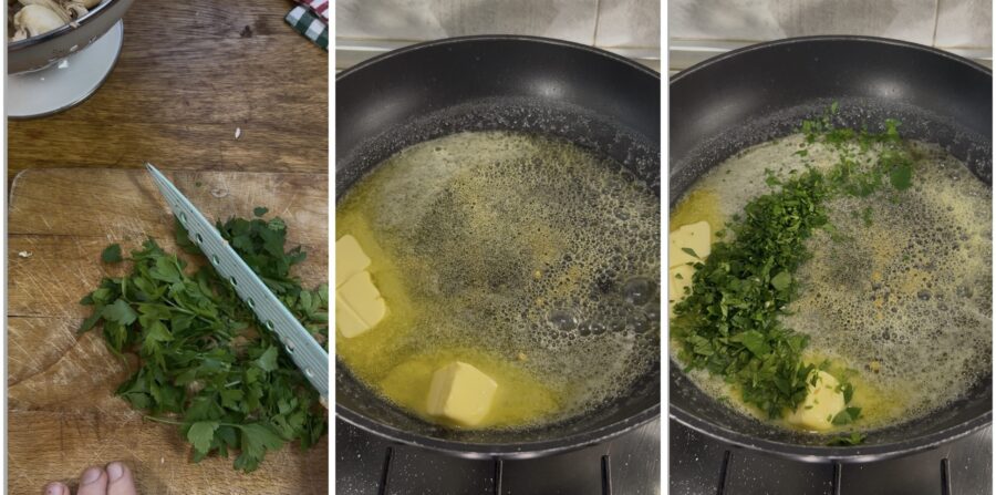 • Para fazer os gnocchi com cogumelos refogados, derreta delicadamente a manteiga na frigideira e adicione o alho seco ou fresco (eu tinha o seco), pique finamente a salsinha e junte aos demais ingredientes. Cozinhe por poucos segundos sem deixar queimar e junte
