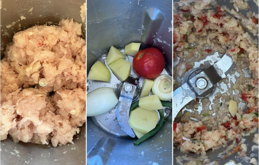 Você não deve obter uma “creme”, mas sim uma carne moída. Quando estiver pronta, reserve a carne e pique junto a batata, a cebola e o tomate já limpos e, se necessário, sem casca. Misture a carne e os legumes,