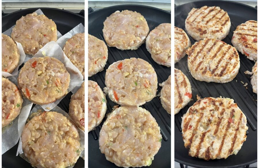 Hambúrguer de frango light feito em casa. Hoje eu vou mostrar como é fácil preparar em casa hambúrgueres de frango saudáveis, leves e deliciosos, com ingredientes que conhecemos e, principalmente, sem conservantes nem aditivos. Visto o sucesso dos nossos Hambúrgueres caseiros recheados e dos nossos Hambúrgueres de cebola, hoje pensei em trazer outra versão de hambúrguer, mas com carne branca. Para fazer a receita desses hambúrgueres de frango light, suculentos e saborosos, eu juntei ao frango moído do peito (feito em casa) um pouco de batata ralada para deixá-los macios e cebola e tomate para dar sabor e perfume — o resultado foi realmente único. Depois de cozidos, você pode saborear os hambúrgueres de frango como um segundo prato leve e saboroso, ou usá-los para rechear gostosos Pães para hambúrguer, enriquecendo com bacon, alface, queijo e MAIONESE PASTEURIZADA FEITA EM CASA para preparar um jantar que deixará toda a família feliz. Prontos para me acompanhar na cozinha? Vamos lá, mas antes lembro que, se quiserem ficar por dentro das novas receitas, podem seguir minha página Facebook e meu perfil Instagram e que, na nossa coletânea: “Peito de frango: receitas rápidas e gostosas“, vocês vão encontrar várias outras ideias para cozinhar o peito de frango.