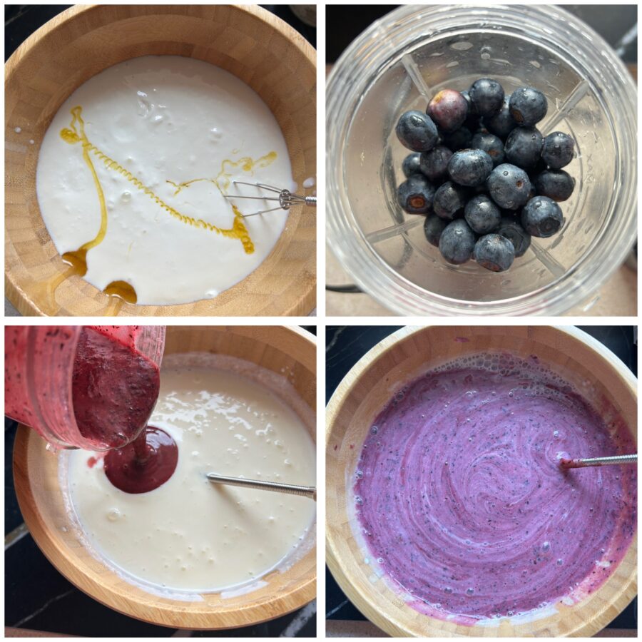 Despeje o purê de mirtilos no iogurte e misture até obter uma mistura uniforme.
