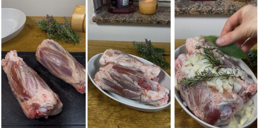 Para preparar os jarretes de porco na cerveja, comece salando e pimentando-os. Depois de massageá-los para que absorvam o tempero, coloque um ramo de alecrim e algumas folhas de louro numa assadeira, acomode os jarretes e distribua por cima a cebola picada,