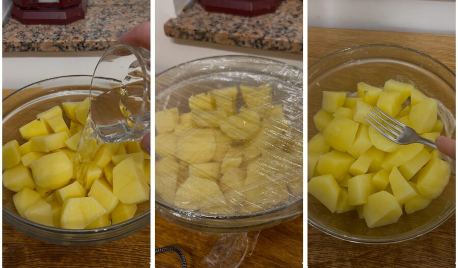 Descasque as batatas, lave-as, corte em pedaços e coloque numa tigela com meio copo de água. Cubra com filme plástico e cozinhe no micro-ondas por 20 minutos a 750W; como alternativa, cozinhe normalmente em água e, uma vez cozidas, escorra. Enquanto as batatas ainda estiverem quentes, amasse com um garfo, mas não bata no liquidificador porque ficariam pegajosas.