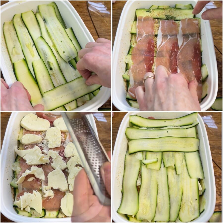 • Faça uma camada de abobrinha, uma de presunto (cru ou cozido), uma de muçarela, um pouco de grana ou parmesão ralado e uma pitada de farinha de rosca. Continue alternando camadas de abobrinha e recheios até quase acabar.
