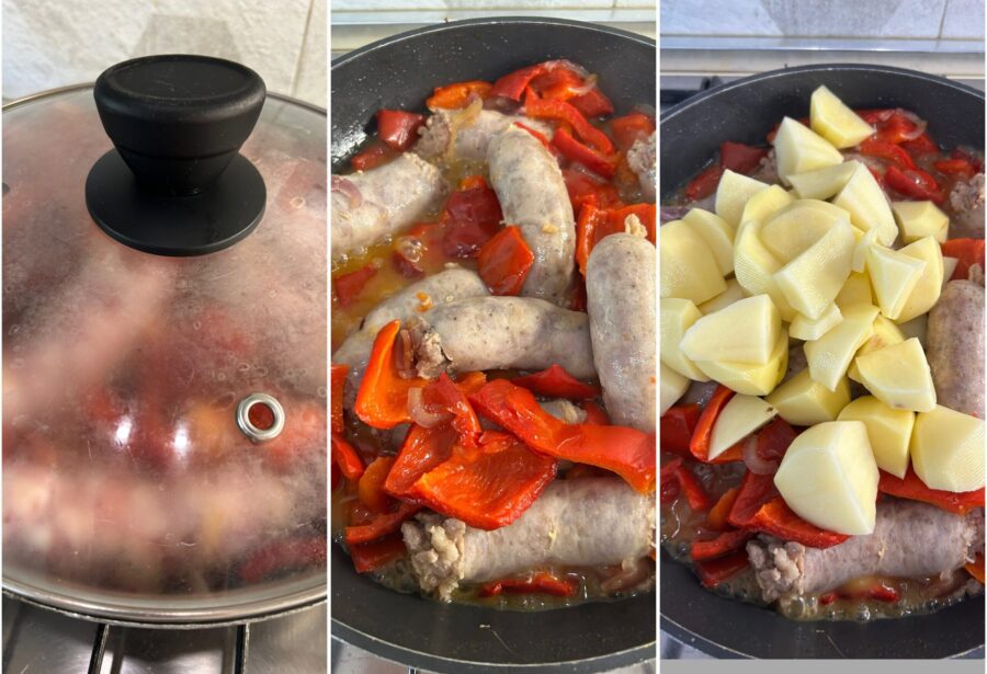 Preparo da linguiça na frigideira com batatas e pimentões