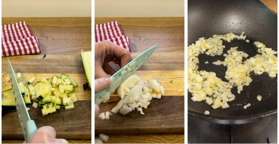 Lave a abobrinha, retire as extremidades e corte em cubinhos bem pequenos, então descasque e pique a cebola. Deixe a cebola murchar em uma boa quantidade de óleo,