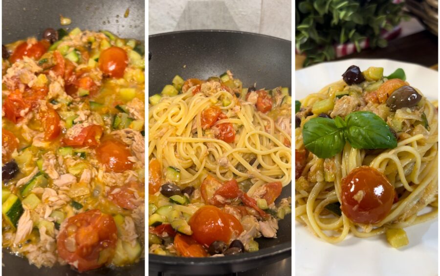 Passos para fazer as Linguine com atum, abobrinha e tomatinhos