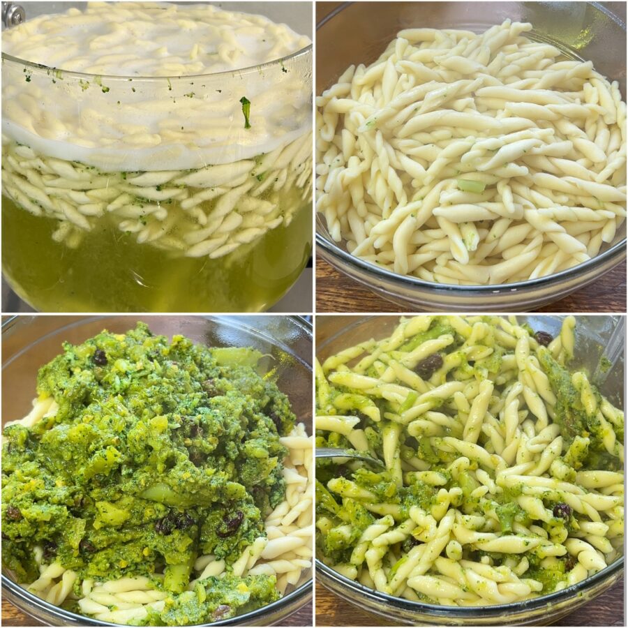 • Acrescente a uva‑passa, os pinhões ou a castanha picada (eu usei pistaches) ou os pinhões. Despeje uma concha da água do cozimento dos brócolis.