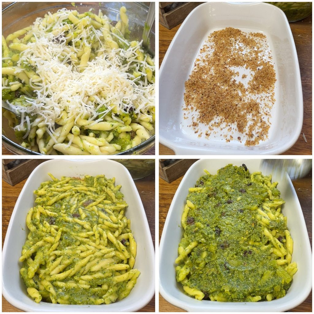• Eu usei massa fresca, que suporta melhor o cozimento e fica mais saborosa. Misture 2/3 do creme de brócolis e metade do queijo ralado e mexa. Faça uma camada de “muddica atturrata” (explico abaixo como preparar), no fundo de uma assadeira; coloque metade da massa, espalhe um pouco do creme de brócolis, distribua queijo ralado e depois