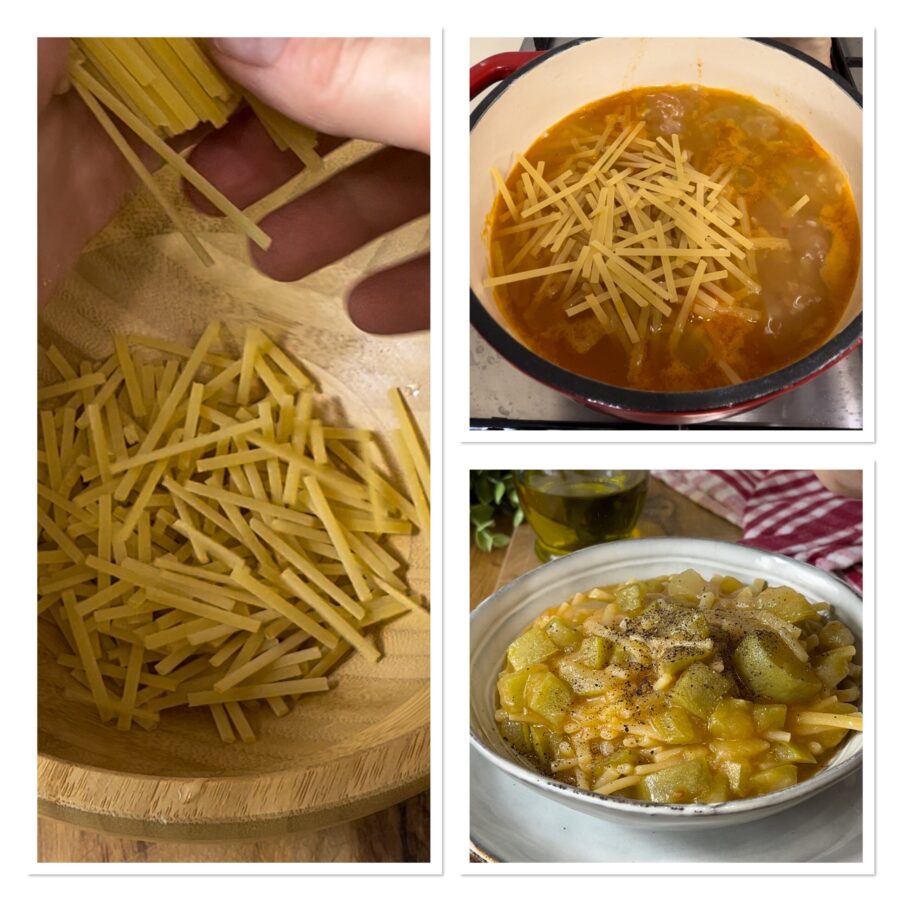 Macarrão com abobrinha comprida e batatas, a sopa de verão siciliana com macarrão quebrado e abobrinha comprida. Um prato simples e muito saboroso, parte da cozinha siciliana e das receitas da vovó, uma receita tradicional que para mim lembra os verões em Pedara com minha avó materna. Quando eu era criança, meu avô Carmelo, na nossa casa de campo, gostava de cultivar as abobrinhas compridas — também chamadas abobrinhas pergola —, bem finas e longas, de cor verde-clara, as mesmas das quais se colhem os tenerumi. A vovó com essas abobrinhas preparava a sopa de abobrinha, batata e tomate, e quando não a comíamos com o pão caseiro, ela também nos fazia um macarrão cremoso delicioso. Claro, na época o macarrão com abobrinha e batatas, perfeito para uma refeição vegana ou vegetariana, não era meu almoço preferido, mas agora, com os anos que passaram e os avós já se foram, essa sopa me leva de volta no tempo, lembra as tardes de fim de verão, o sol no pôr do sol e os aromas de uma cozinha já guardada nas lembranças. Típico do verão, apesar de ser um prato quente, essa sopa de macarrão, abobrinha e batatas traz muitos benefícios, nos oferecendo não só vitaminas e fibras, mas também líquidos e sais minerais — um verdadeiro remédio caseiro para experimentar, que a vovó deixava ainda mais gostoso ao acrescentar no final do cozimento uma boa mãozinha de parmesão ou grana.