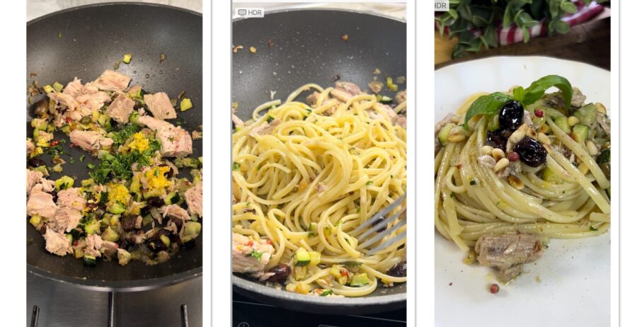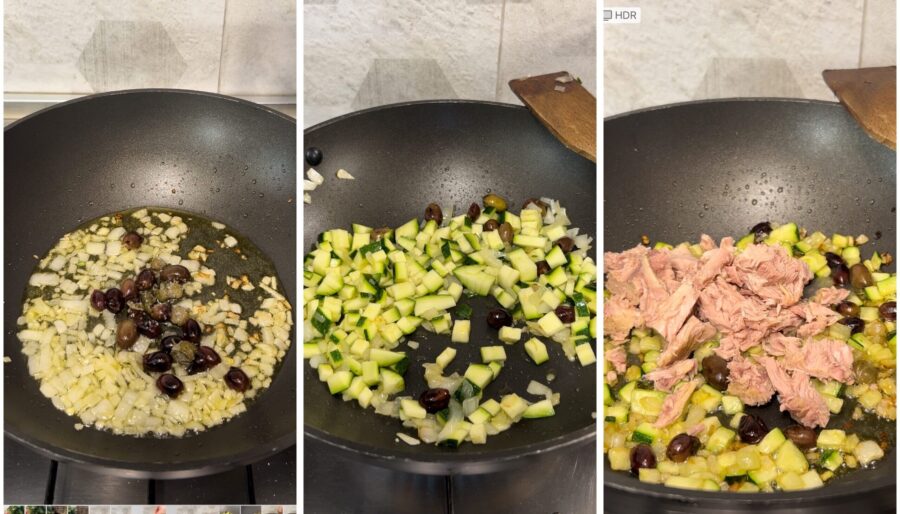 acrescente as azeitonas e as alcaparras e deixe cozinhar por alguns minutos, então adicione as abobrinhas e deixe dourar. Com o fogo desligado e as abobrinhas cozidas, junte o atum escorrido,