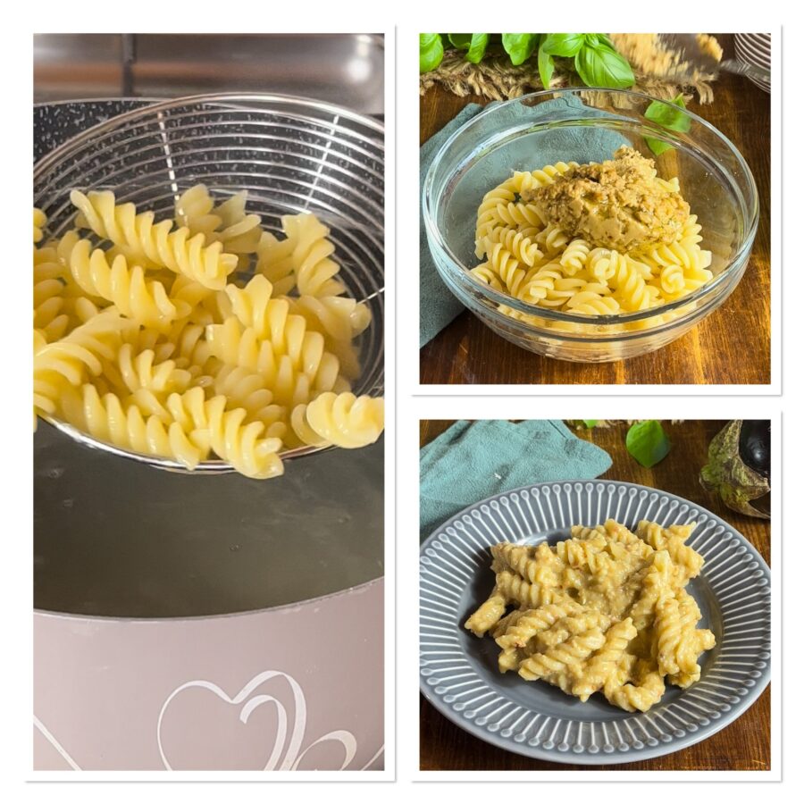 Cozinhe a massa, escorra al dente e tempere com o creme preparado e um pouco da água do cozimento, misture e sirva imediatamente. O macarrão com creme de berinjela deve ser servido na hora; se sobrar, você pode conservar na geladeira por um dia, aquecendo numa frigideira com um fio de óleo.
