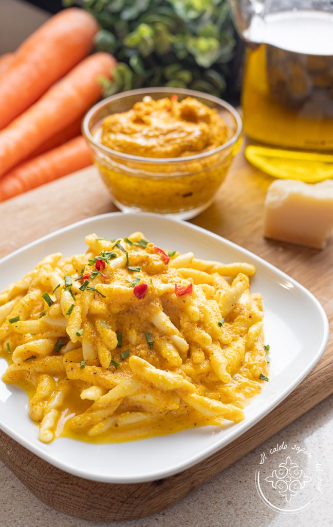 Para prepará-lo, basta utilizar o pesto de cenoura , um molho fácil e versátil que se presta a várias preparações e faz parte da nossa coletânea dedicada aos pestos caseiros. Para esta receita você pode usar massa fresca ou massa seca como as busiate, macarroni,cavatelli, para obter um dos pratos principais mais simples e gostosos que você já possa provar!