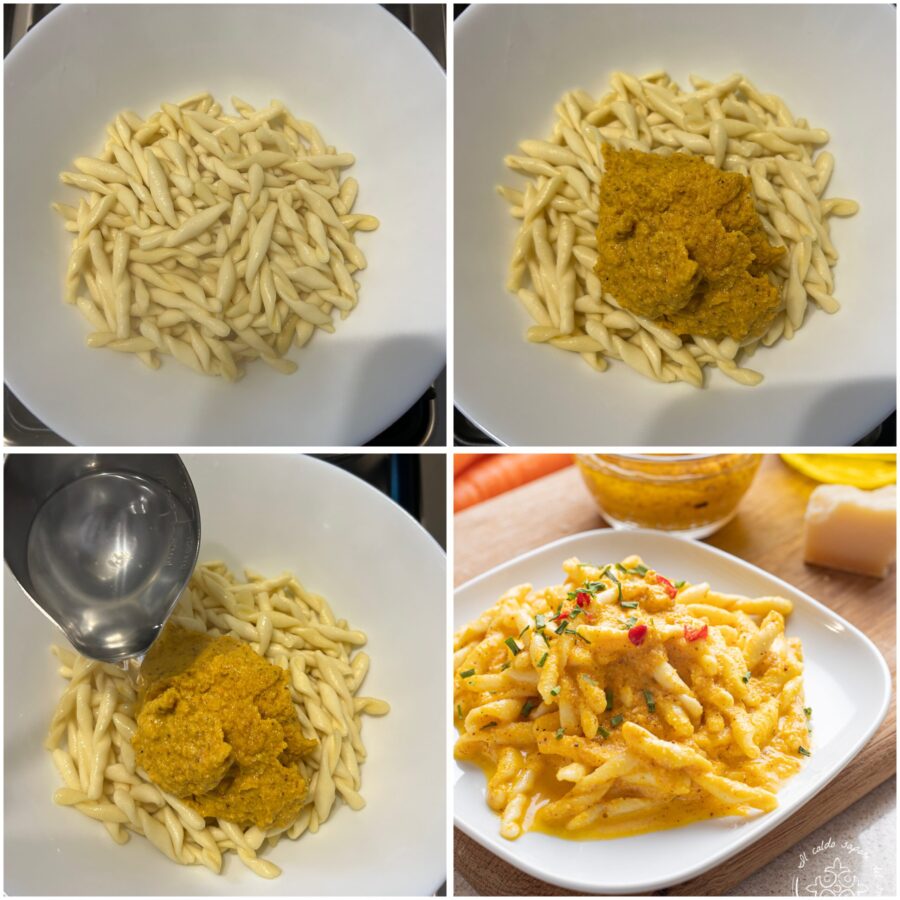 Despeje o pesto de cenoura sobre a massa ainda quente e acrescente algumas colheres da água do cozimento.