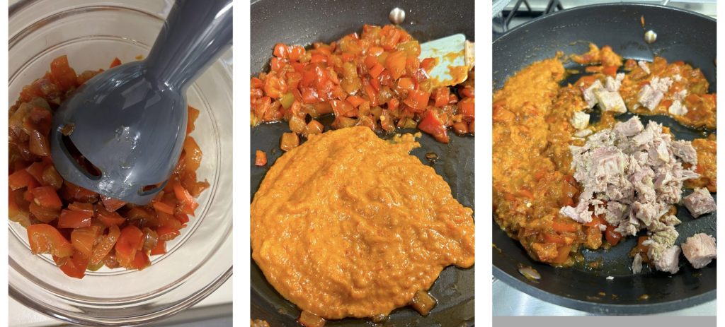 Bata metade dos pimentões no mixer até virar um creme e junte na frigideira com o restante dos pimentões e o atum escorrido.