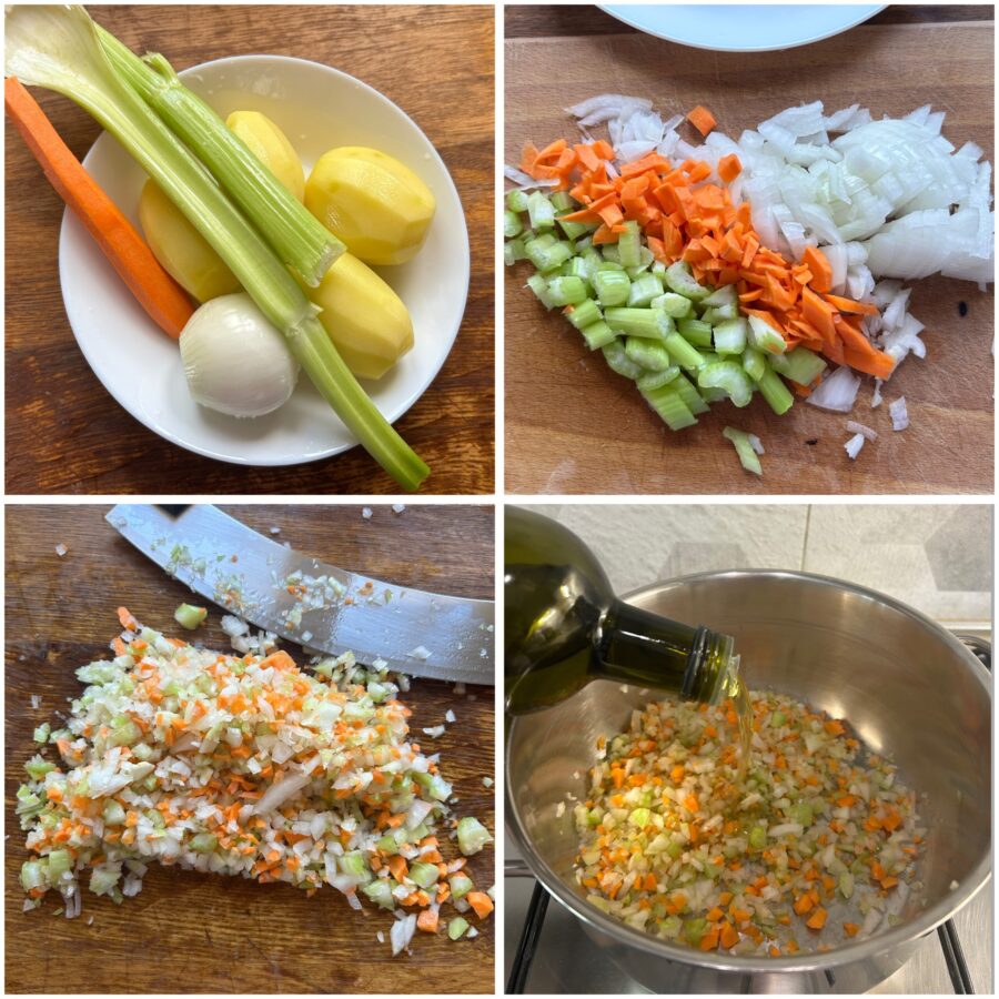 • Para fazer a massa com batatas à napolitana comece preparando um bom refogado de aipo, cenoura e cebola. Junte-o em uma panela de fundo grosso com um fio generoso de azeite e deixe murchar em fogo baixo.
