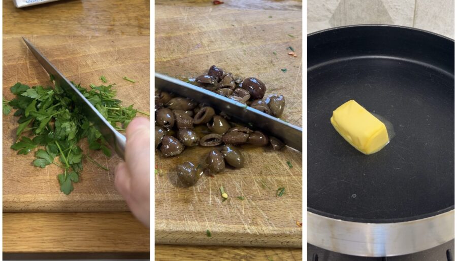 Para fazer este prato principal rápido e diferente com manteiga e azeitonas, comece colocando a água para a massa no fogo e então dedique-se ao molho.
