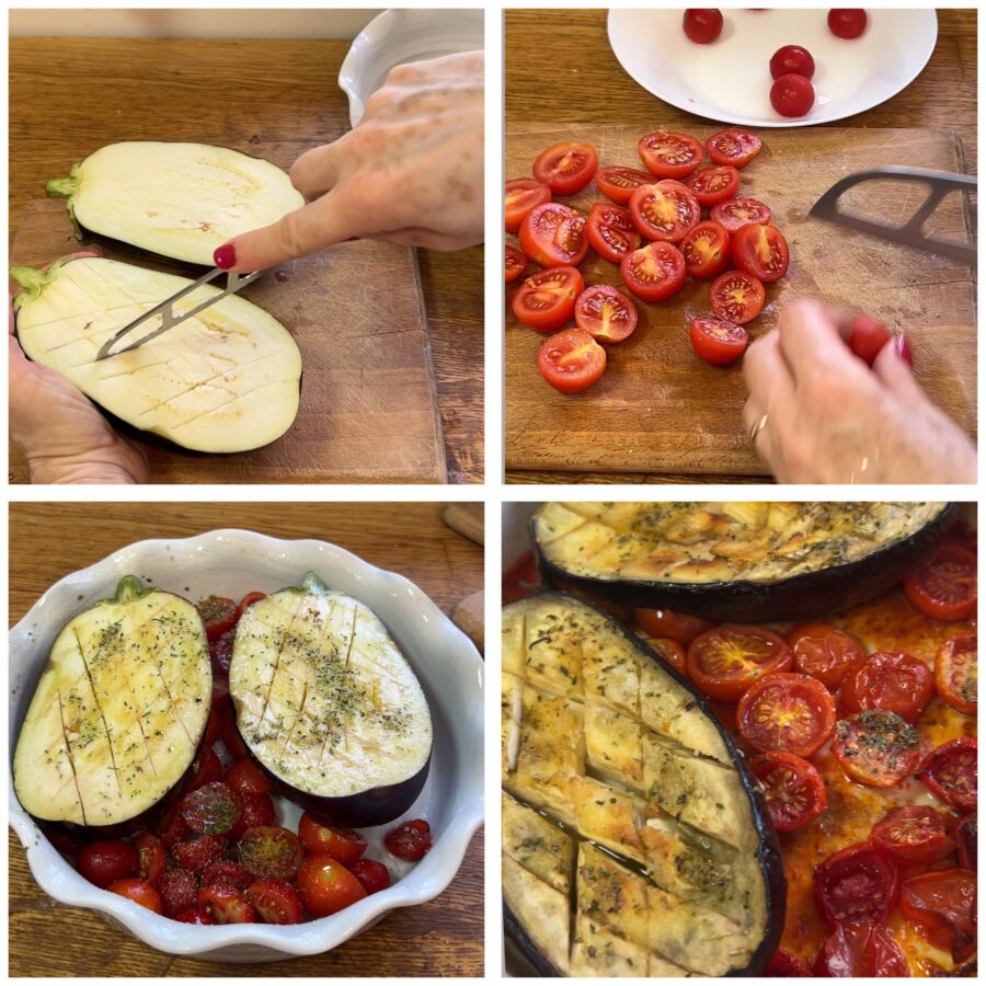 Faça cortes transversais na polpa em forma de x. Regue com um fio de azeite, tempere com sal e disponha em uma assadeira. Para fazer os tomatinhos confit, lave-os e corte-os ao meio, junte-os na mesma assadeira onde colocou as berinjelas e tempere com um pouco de sal e uma pitada de açúcar, uma pitada de orégano, um pouco de alho em pó ou picado e dê 3-4 borrifadas de azeite.