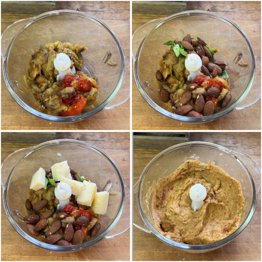 Retire a pele das berinjelas e coloque a polpa no copo do liquidificador, junto com os tomatinhos, mas lembre-se de reservar alguns para a decoração do prato. Adicione as amêndoas tostadas, o manjericão, o azeite, o queijo e bata tudo até obter uma mistura cremosa.