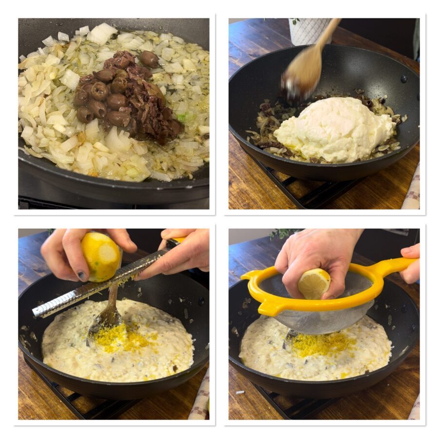 Para fazer essa massa deliciosa comece descascando e picando uma cebola, então doure-a em um bom fio de azeite junto com os filetes de anchova. Quando a cebola estiver murcha e as anchovas desfeitas, junte as azeitonas — metade picadas e metade inteiras.
