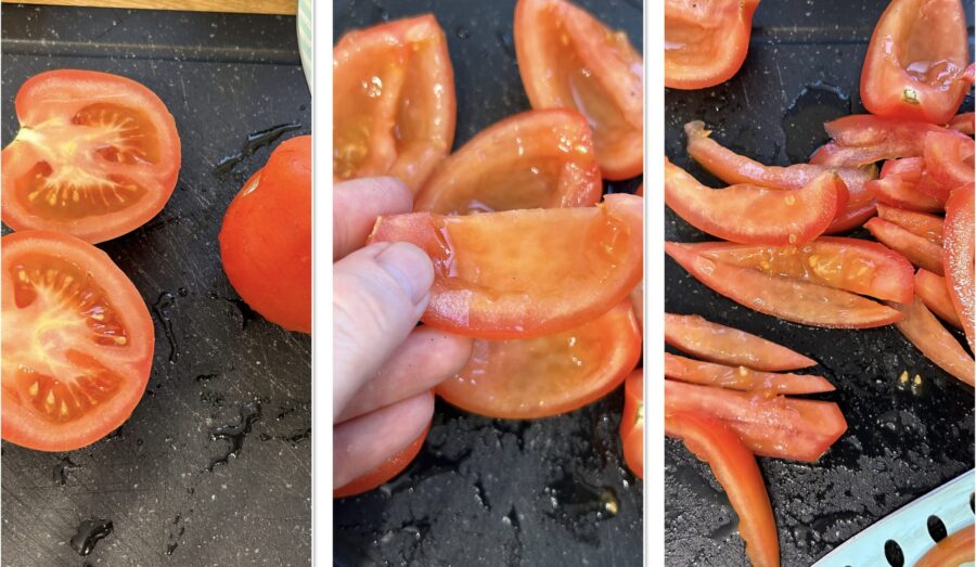 • Leve ao fogo uma panela cheia de água levemente salgada até ferver e, enquanto isso, prepare os ingredientes que você vai usar para temperar a massa. Lave os tomates — eles devem estar maduros, frescos e firmes — seque-os e enxugue com papel-toalha, corte-os em quatro partes, retire as sementes e a parte mais aquosa, e corte-os em cubinhos.