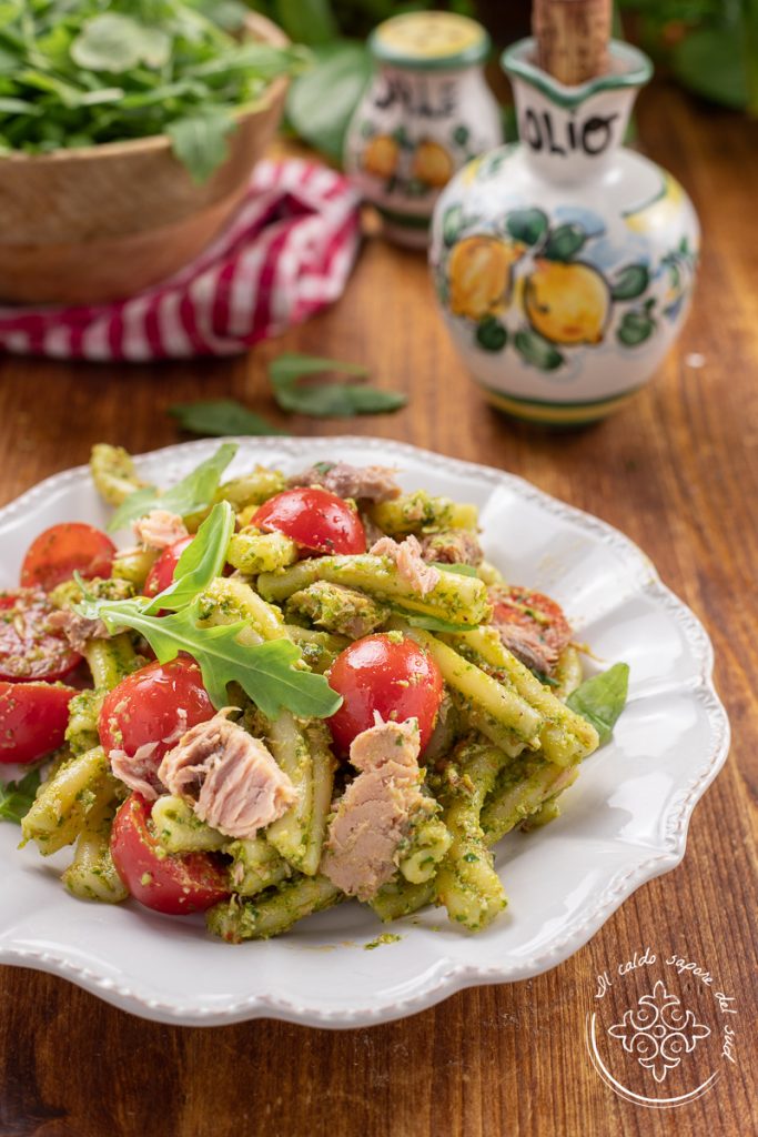 Massa fria com pesto de rúcula, atum e tomatinhos. O pesto de rúcula aqui em casa foi uma surpresa agradável, simples de fazer e muito saboroso: é ótimo no pão, nas bruschettas, na pizza e, sobretudo, com massa. Ideal para preparar pratos frios e, principalmente, massas de verão rápidas como a massa fria com pesto de rúcula, atum e tomatinhos. No verão, sabe-se, os primeiros pratos frios são um must e por isso também me arrisco em massas frias para levar à praia, para o escritório ou para comer depois de um longo dia fora de casa. A massa com pesto de rúcula e tomatinhos responde muito bem a essas necessidades e hoje quero contar como eu a preparo. Prontos para correr comigo na cozinha? Então vamos, vocês vão ver que delícia, mas antes lembro que, se quiserem ficar atualizados sobre todas as minhas receitas, podem seguir minha página no Facebook (aqui) e meu perfil no Instagram (aqui).