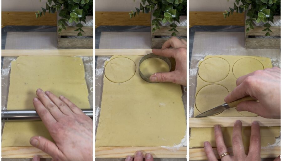 Retome a massa, trabalhe-a um pouco para recuperar a elasticidade e, com a ajuda do rolo e das guias, abra uma folha com 3-4 mm de espessura. Corte discos usando os aros e recorte também tiras.