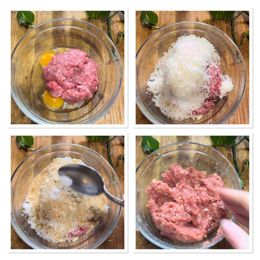 • Em uma tigela grande, junte a carne moída, o queijo, os ovos e a farinha de rosca, uma pitada de sal e trabalhe até obter uma mistura homogênea e consistente. Deixe descansar por dez minutos.