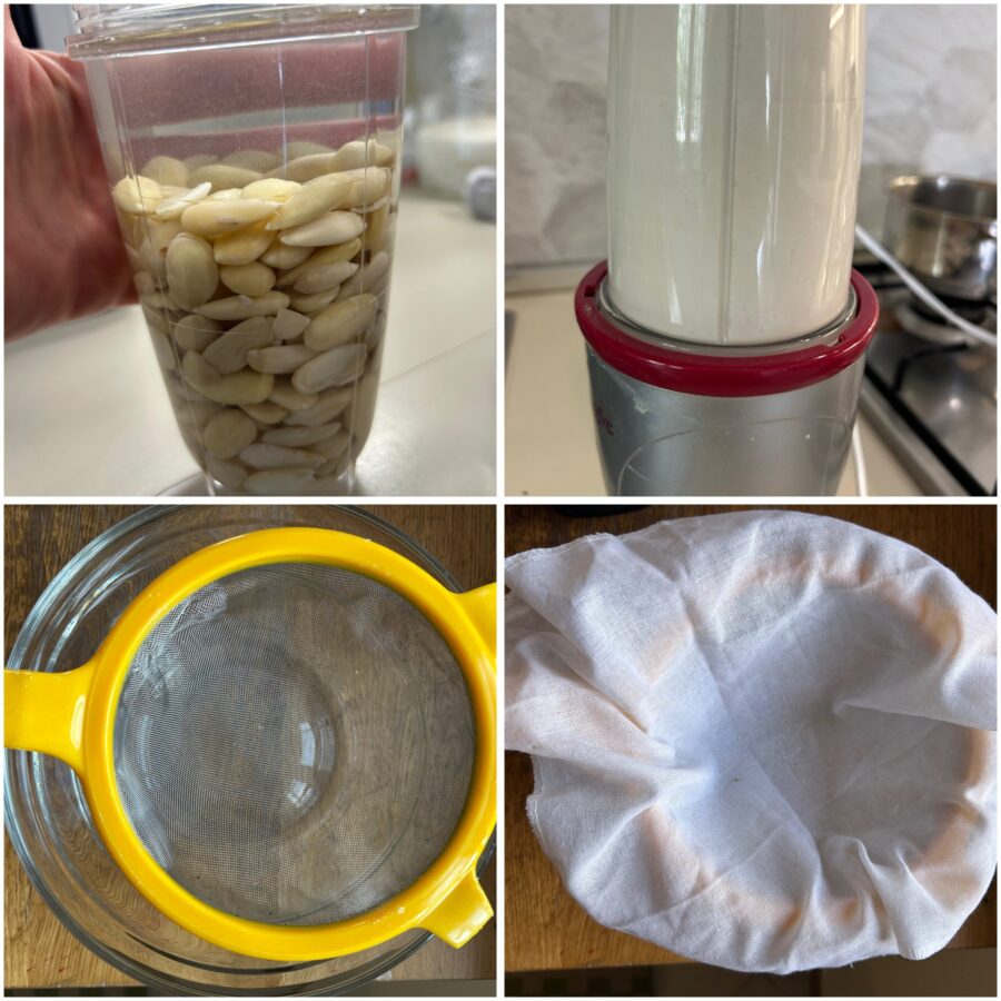• Bata as amêndoas com meio litro de água: você precisará de um liquidificador muito potente ou de um homogeneizador (link acima). Se não conseguir bater tudo de uma vez, proceda com metade e depois com a outra. Apoie uma peneira sobre uma tigela, forre-a com um pano limpo que não cheire a detergente e despeje a mistura.