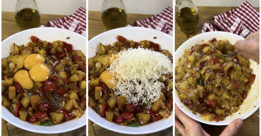 • Coloque tudo em uma tigela, adicione os ovos e o queijo e misture bem.
