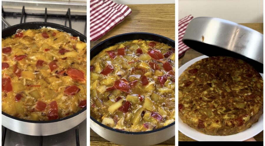 • Depois desse tempo, quando o omelete estiver firme, com a ajuda da própria tampa ou de um prato grande, vire-o e cozinhe por mais 10 minutos. O omelete de batata e pimentão está pronto; vire em um prato de servir e sirva.