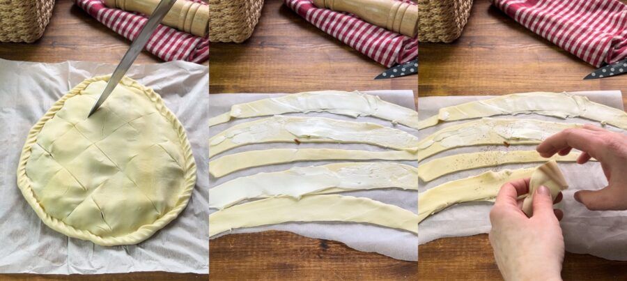 • Faça cortes leves na superfície da massa. Utilize as sobras recheando-as com um pouco de queijo cremoso e sobrepondo-as; depois modele formando um grande laço para colocar no topo do ovo.