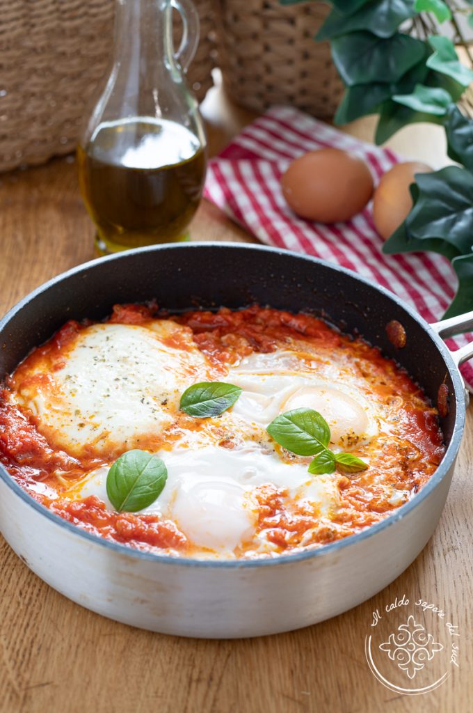 Coloque no fogo uma frigideira com o molho de tomate, ajuste o sal e cozinhe em fogo médio por cerca de dez minutos, deixando o molho reduzir bem. Agora junte as mussarelas cortadas ao meio, os ovos e uma pitada de orégano, tampe a frigideira com sua tampa e deixe cozinhar por 3 minutos ou até atingir a consistência desejada dos ovos. Retire do fogão, sirva imediatamente e decore, se tiver e estiver na estação, com folhas de manjericão.